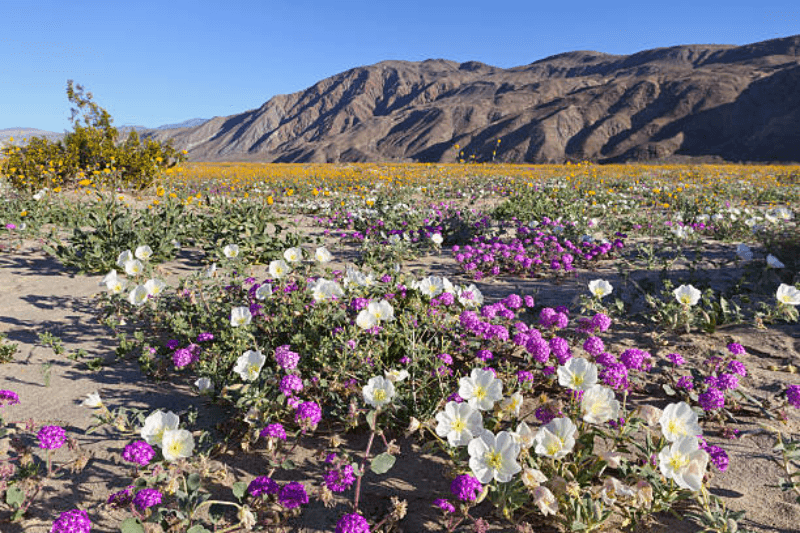 Anza-Borrego Desert State Park marks the coming of a superbloom. Since the end of January, Henderson Canyon Road has been ablaze with desert sand verbena ( Abronia villosa ), brown-eyed primrose ( Chylismia claviformis ), and desert sunflower ( Geraea viscosa ) as the low amount of rain ( 200% normal) awakened dormant seeds following the poor performance in 2025. Coyote Canyon has sprouts, although it is gated past Third Crossing.
